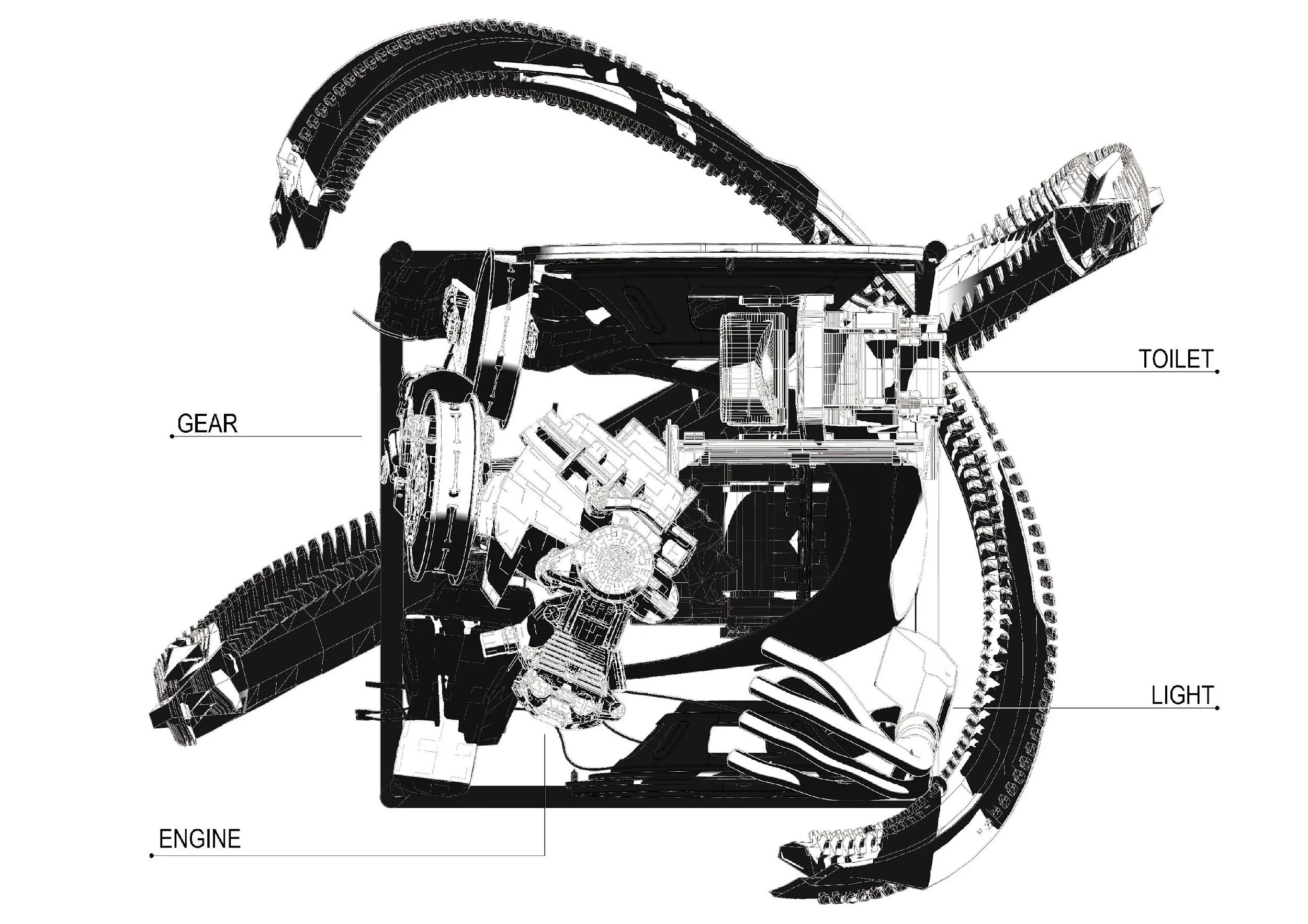 This project challenges the static nature of traditional architecture, embracing mobility as an intrinsic spatial condition. Constructed from repurposed automotive components, the Nomadic Unit redefines habitation as a state of perpetual motion—where living and movement are inseparable. Every mechanical part, from gears to structural frames, is not merely salvaged but recontextualized, forming an intricate system where architecture behaves like a machine, adapting dynamically to its environment.